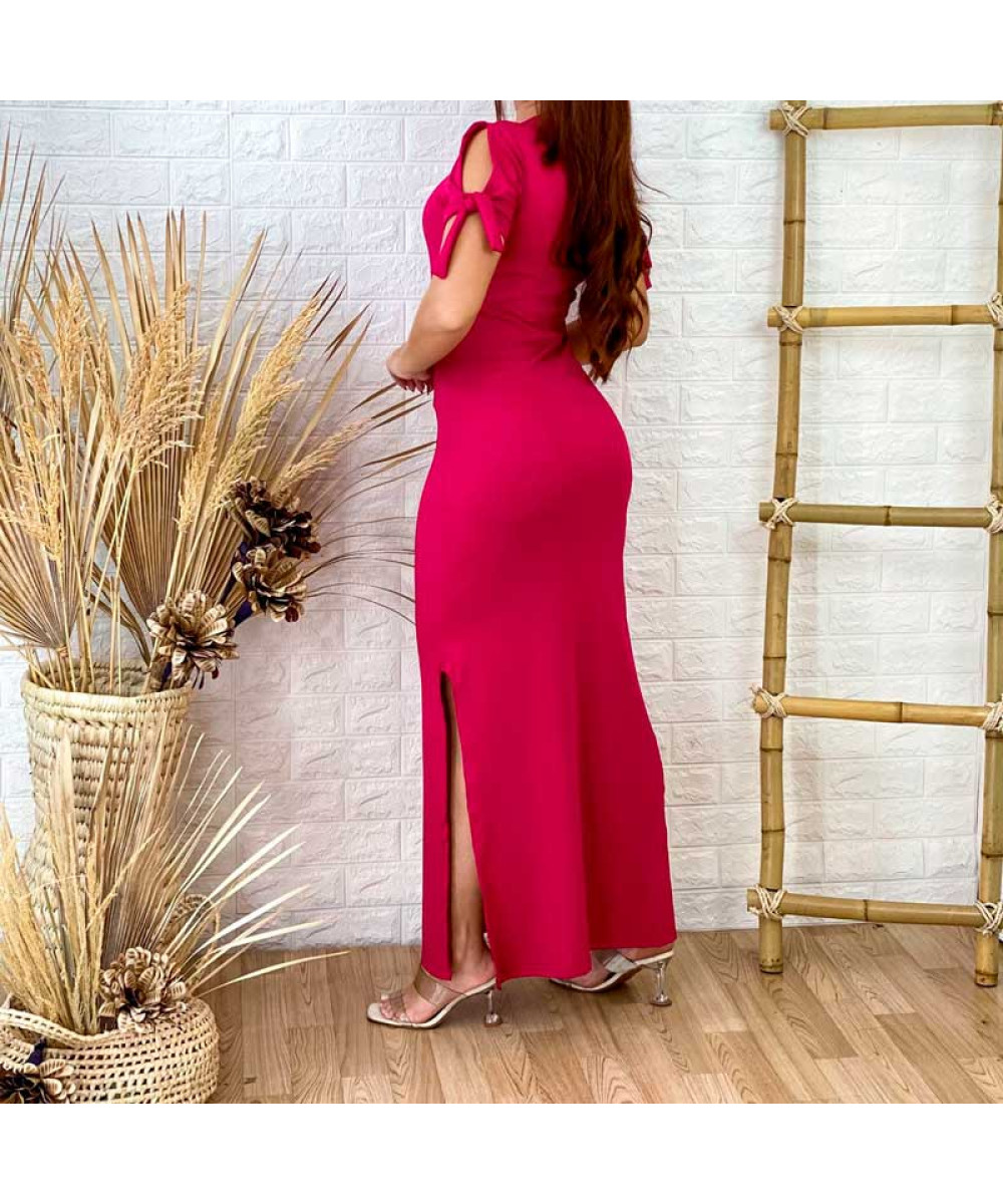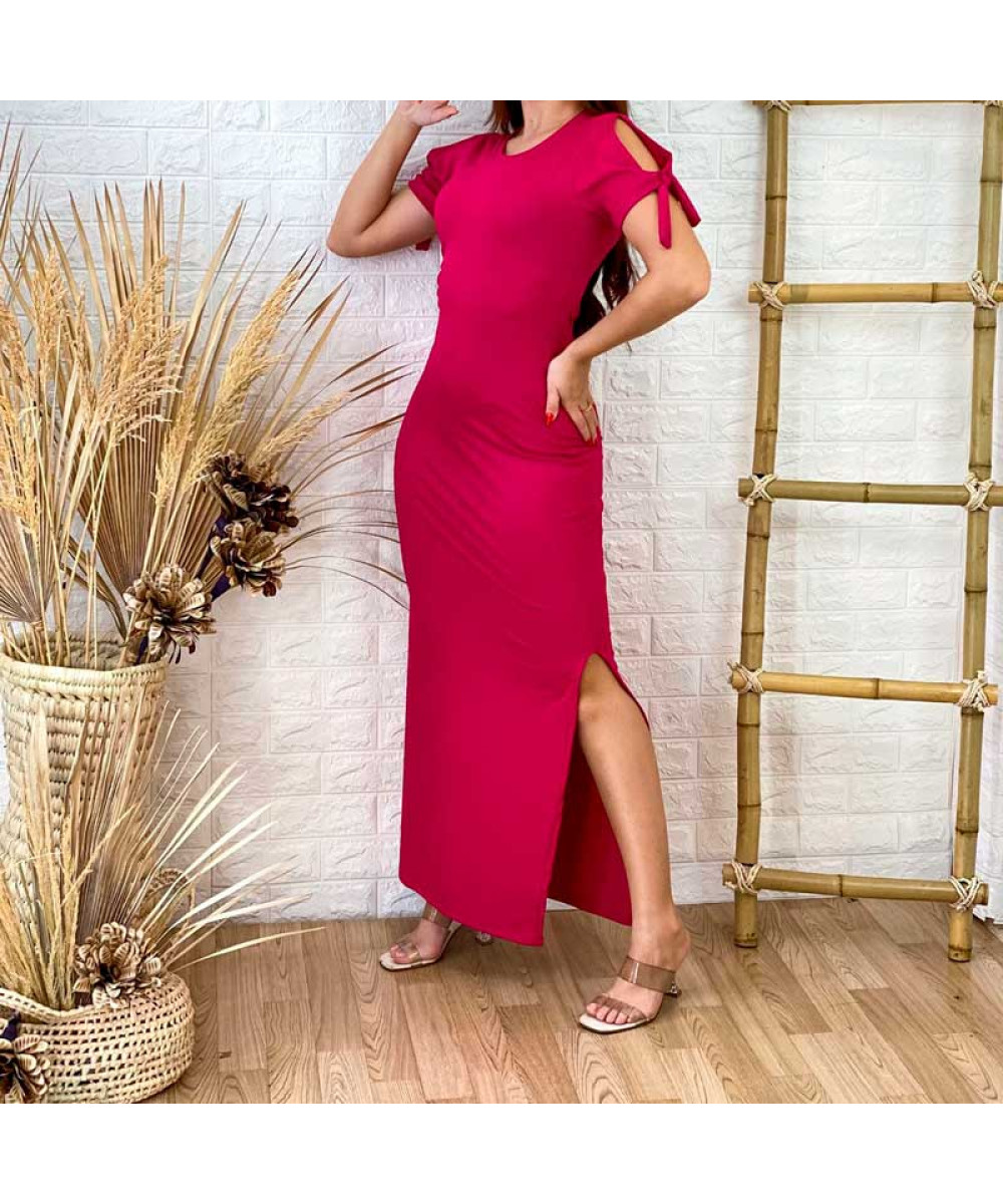 Vestido Longo Com Manga Lacinho, confeccionado em Malha Canelada, tecido leve e confortável, não é transparente, seu modelo é de Manga Curta com abertura para uns lacinhos e na barra uma linda fenda com abertura dos dois lados para dar um destaque, comprimento longo, com excelente acabamento, é tendência na moda evangelica, e na moda feminina por compor looks elegantes e sofisticados. Compre para revender.